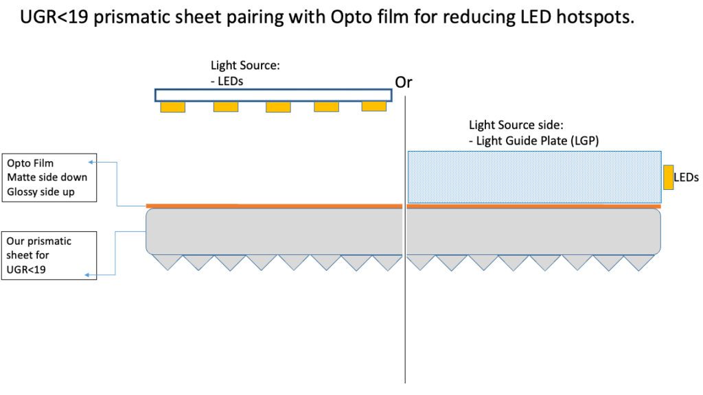In der professionellen LED-Beleuchtung ist die Kombination von klaren mikroprismatischen Folien mit Diffusorfolien eine gängige Praxis, um ein weiches, opalartiges Leuchten zu erzielen und gleichzeitig den UGR-Wert für eine angenehme, blendfreie Beleuchtung zu reduzieren.