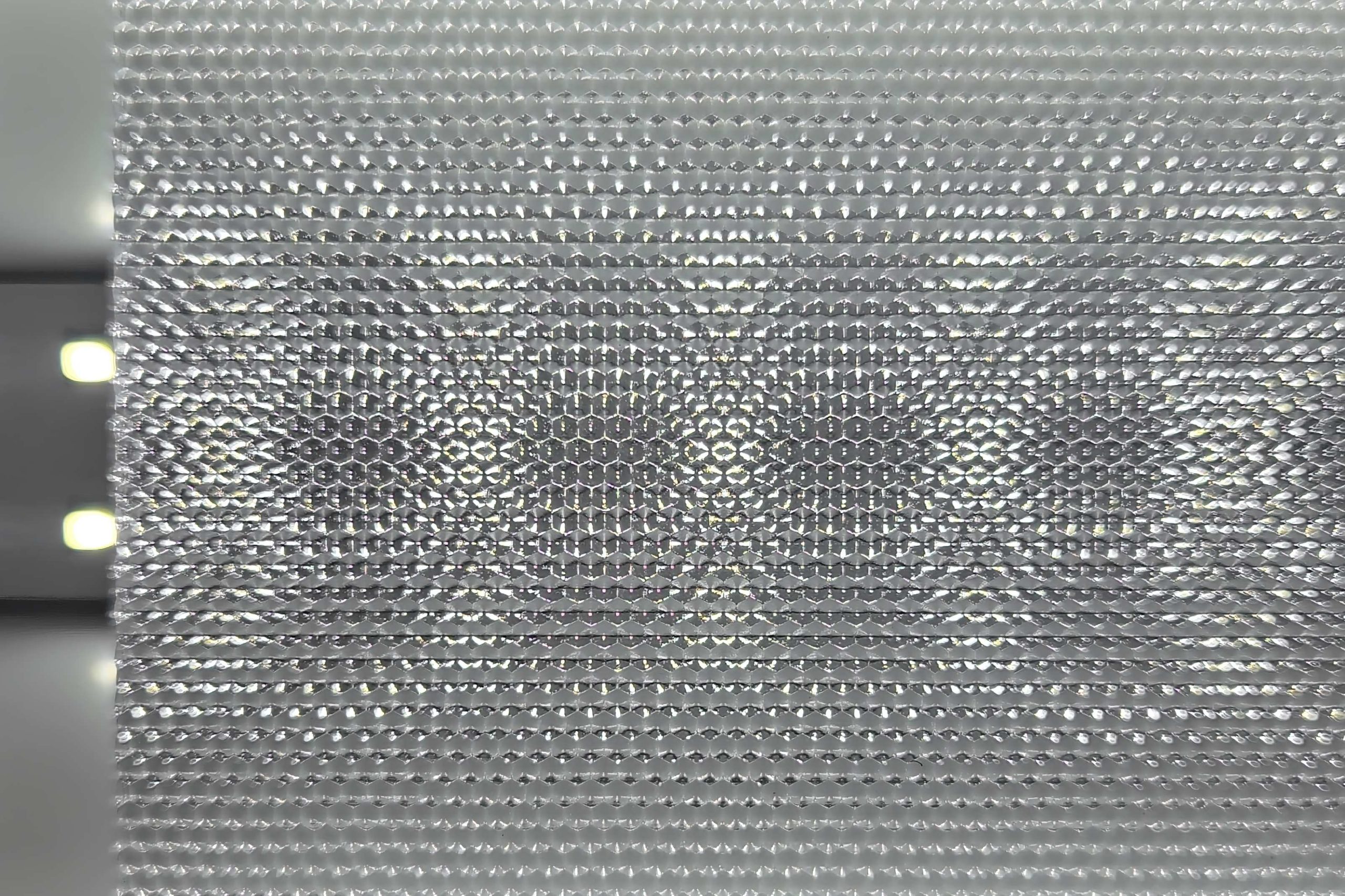 Activation géométrique Remarquez comment les prismes hexagonaux « s’activent » lors de l’allumage. Chaque cellule convexe capture le flux LED brut et non contrôlé pour le rediriger vers le plan de travail utile, supprimant physiquement l’éblouissement à angle élevé pour atteindre la conformité UGR < 19.