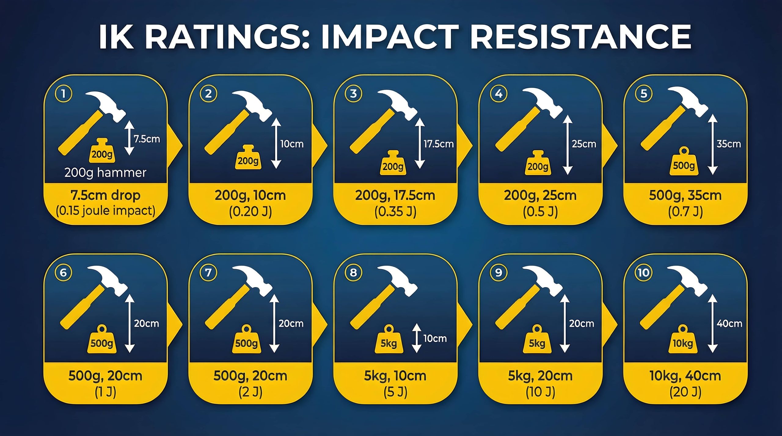 - IK01 to IK05: Protected against impacts less than 1 Joule. (Think: A very light knock during routine cleaning).