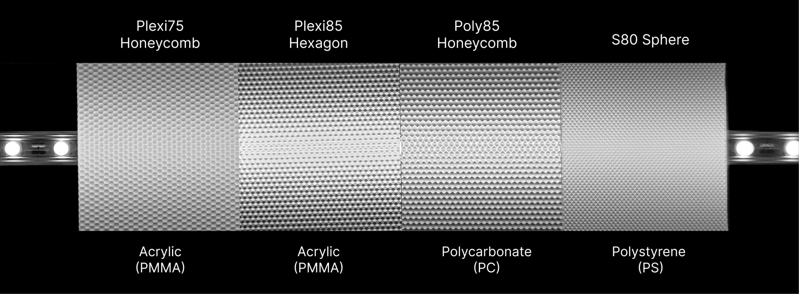 | Plexi85 Hexagon | Acrylic (PMMA) | 2 | 85% | UL94 HB | Optical clarity, high transmission, uniform luminance. | 0.078 |