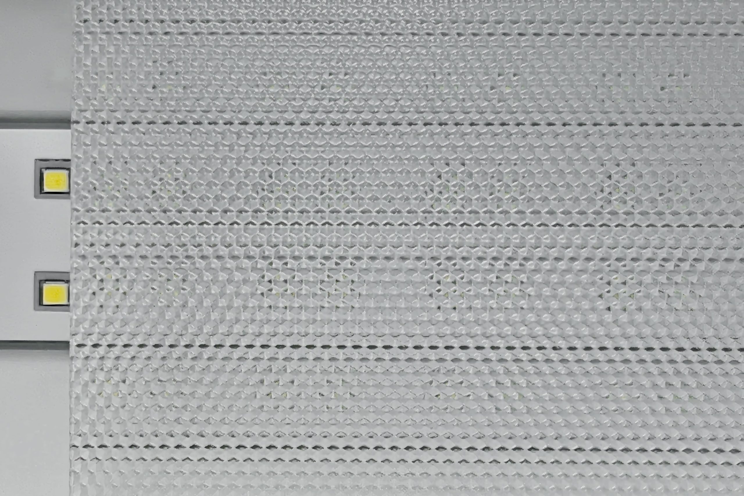 Notice how the hexagonal prisms ‘engage’ upon illumination. Each convex cell captures raw, uncontrolled LED output and redirects it into the useful task plane, physically suppressing high-angle glare to achieve UGR <19 compliance.