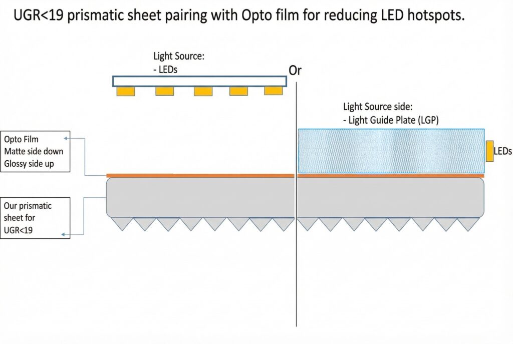 O Filme/Folha Difusora (Uniformidade): Fica atrás ou em cima dos prismas para ocultar os “pontos quentes” dos LEDs e suavizar a luz, garantindo que a saída seja uniforme sem perder as propriedades de controle de ofuscamento dos prismas.